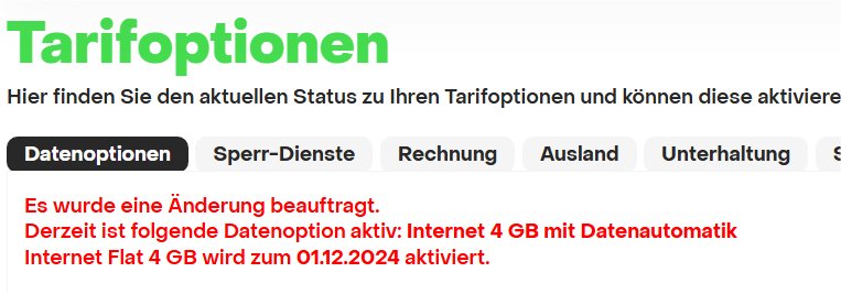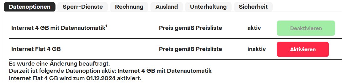 Doch, denn ausgewählt sein sollte und müsste: Internet Flat 4 GB. Ist sie aber nicht. Warum weiß nicht, vor ein paar Monaten war diese noch aktiv (siehe SMS oben).