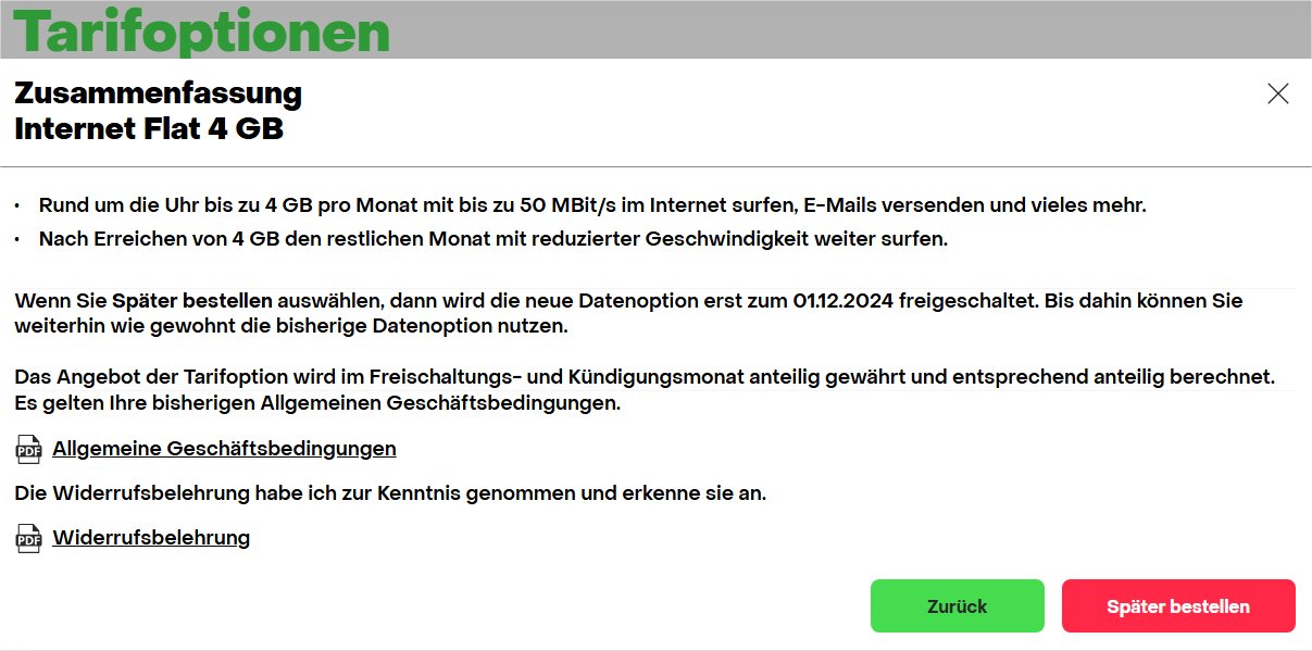 Eine E-Mail folgte ebenfalls zeitnah, die unter anderem beinhaltet: „[…] vielen Dank für Ihren Auftrag. Wir werden die von Ihnen gewünschte Datenoption Internet Flat 4 GB DU LTE 50 am 01.12.2024 einrichten. Es gelten die Preise und Konditionen der aktuellen Tarifübersicht und die Allgemeinen Geschäftsbedingungen der Drillisch Online GmbH. […] Eine Optionsänderung ist nur in einem ungekündigten Vertragsverhältnis möglich. Weiterhin viel Spaß beim mobilen Telefonieren und Surfen. Wichtige Information: Bei Deaktivierung einer kostenpflichtigen Datenoption wird die tarifeigene Datenflat standardmäßig aktiviert. Ist in Ihrem Tarif keine Internetflat inklusive, erfolgt bei Nutzung des mobilen Internets die Abrechnung per GPRS by Call. Beachten Sie bitte Ihre aktuelle Tarifpreisliste.“