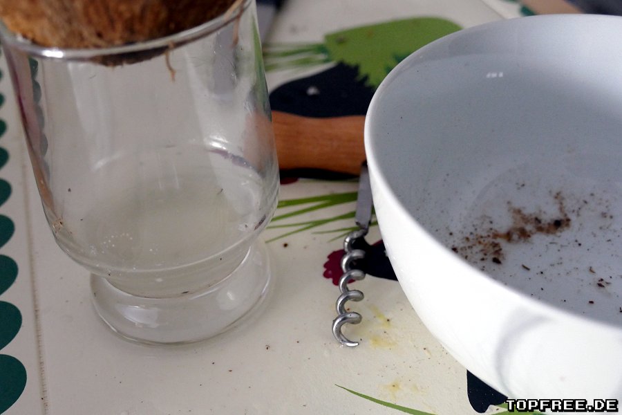Um daraus zu trinken benötigst du allerdings nur einen Korkenzieher. Denn auf der unteren Seite der Kokosnuss befinden sich drei Punkte, die wie Augen aussehen. Oder eher wie zwei Augen und ein Mund. Mal guckt sie grimmiger, mal freundlicher, diese alte Kokosnuss. Den Korkenzieher dreht ihr einfach in zwei Löcher hinein, zieht ihn heraus und voilà. Es kann auch Fruchtfleisch am Korkenzieher hängen bleiben, das ist gar nicht schlimm. Falls ihr keinen habt, versucht es mit einem Schraubendreher oder einer Stricknadel. Dann könnt ihr aus einem Loch das Kokoswasser in ein Glas fließen lassen. Wenn ihr habt stellt noch ein Sieb davor, dann fallen von der Schale keinen Stückchen mit in das Glas. Am Ende ist es trinkfertig.
