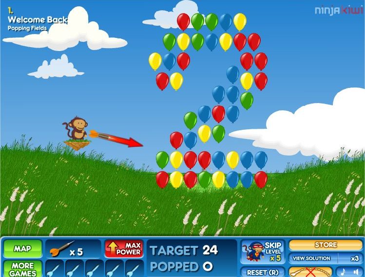 Das kleine Äffchen möchte bitte die Ballons zum Platzen bringen. Dafür stehen dir Pfeile zur Verfügung. Es wird gezielt und möglichst viele Ballons auf einem zu Treffen. Das ist gar nicht so einfach und benötigt eine geschickte Zielrichtung.