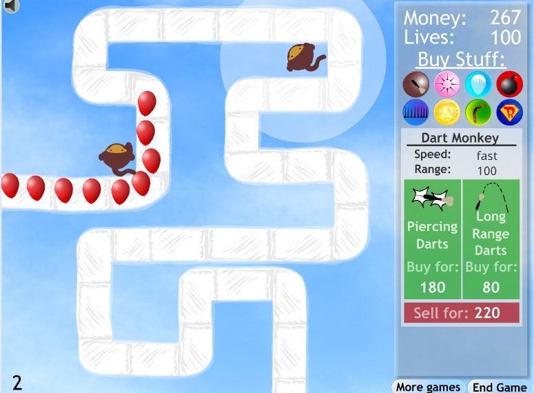 Das Spielprinzip bleibt gleich. Aber in Teil 2 stehen dir im Gegensatz zu Teil 1 acht statt fünf Möglichkeiten zur Ballon-Abwehr zur Auswahl. Diese sind erst nach und nach freischaltbar, da am Anfang zu wenig Geld dafür zur Verfügung steht. Die Stärke der Dartpfeile und die Länge können wieder erweitern werden für den „Dart Monkey“, also den „Dart Affen“. Bei allen anderen Türmen gibt es ebenfalls weitere Optionen.