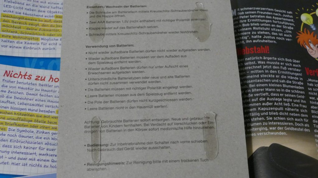 Fans des Kinofilms wird das Magazin in der Auslage direkt ins Auge springen. Allen anderen vielleicht eher das beiliegende Gimmick: Eine Überwachungskamera zur Abschreckung als Extra. Das besteht zwar nur aus billigem Plastik und benötigt zwei AAA-Batterien. Könnte aber in einem kleinen Zimmer oder Kellerraum von weiter weg abschreckend wirken. Nur zu nahe sollte der potentielle Übeltäter nicht an das Plastikteil herankommen. Denn es ist offensichtlich, dass es sich dabei um eine Attrappe handelt. Dennoch: Ich habe es mal aufgestellt und hoffe, dass es außer mir sonst niemand entdeckt – oder eben doch abschreckend wirkt (die rote Lampe leuchtet durchgehend blinkend, wenn eingeschaltet). Etwas ungünstig ist mal wieder die Beklebung auf dem Heft. Nur ganz vorsichtig abgezogen, bleibt das Cover danach gut erhalten. Ansonsten könnte ein Stück vom Heft am Kleber hängen bleiben.