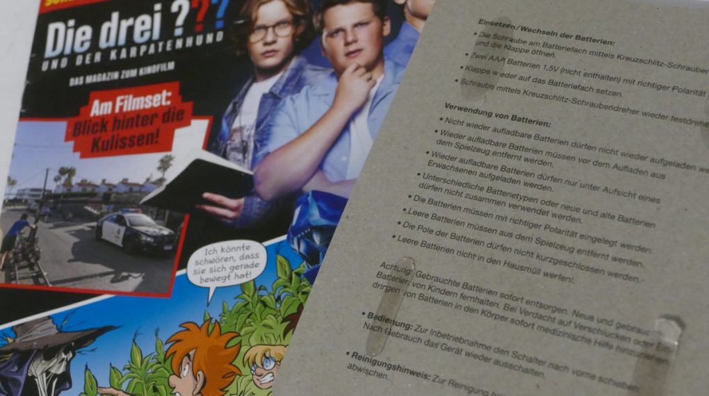 Die drei ??? und der Karpatenhund – Das Magazin zum Kinofilm bietet einen kurzen Lesespaß für die jüngere Generation. Die Rätsel sind sehr einfach gehalten. Schön dabei ist jedoch, dass der Comic nicht einfach nur ein Comic ist, sondern ebenfalls mit Rätseln versehen wurde. Wer den Kinofilm aber nicht sieht, der bekommt wiederum ein offenes Ende des Comics und bleibt etwas unbefriedigt nach dem Lesen zurück. Tatsächlich kenne ich den Film nicht und habe das Heft unabhängig davon gekauft. Braucht man es denn? Fans der drei Fragezeichen bietet das Magazin leider nur sehr wenig Hintergrundinformationen. Es ist ein Mix aus Werbung zum Film und eben nur einer Seite mit Bildern hinter den Kulissen. Das Gimmick ist eher ein Gag, könnte aber tatsächlich als Überwachungskamera-Attrappe eingesetzt werden. Ob’s letztendlich etwas bringen würde? Keine Ahnung. Für 5,99 Euro ist das Heft auf jeden Fall ein bisschen dünn.