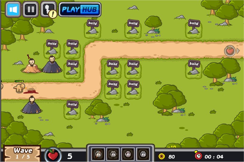Das kleine Tower Defense Spiel funktioniert wie folgt: Baue an den Wegen der Dinos entlang verschiedene Abwehrtürme etc. auf, um die Dinoherde abzuwehren. Zu Beginn stehen dir nur der Flammenwerfer auf dem Vulkan und ein Speerwerfer zur Verfügung. Im Laufe der Levels, kannst du mehr Objekte für die Abwehr gegen die Dinosaurier freischalten.
