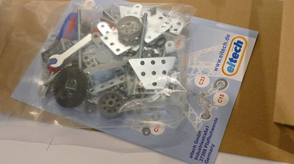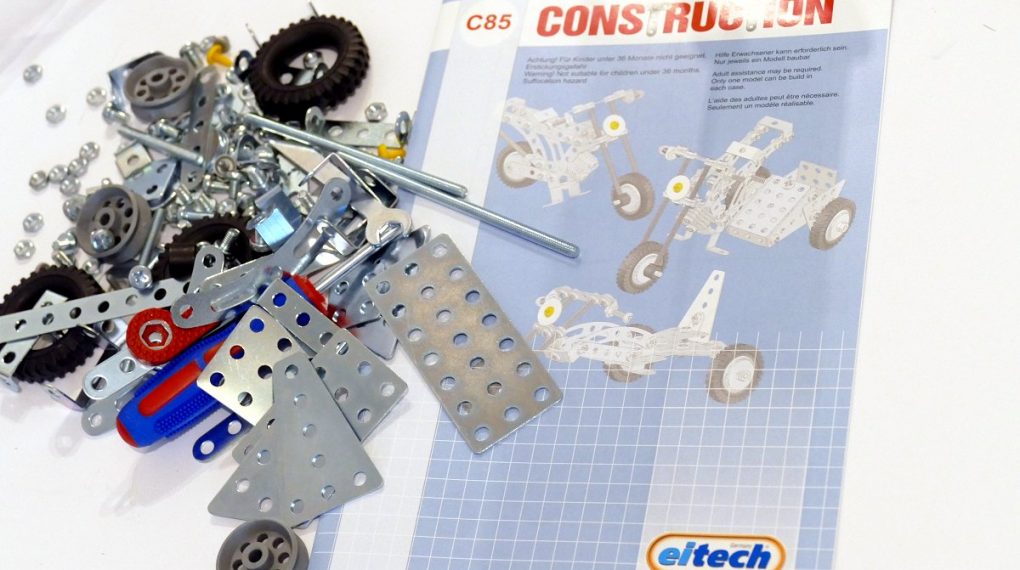 Das Set besteht laut Verpackungsangabe aus 170 Teilen und soll für Kinder ab 8 Jahren geeignet sein. Enthalten ist bereits alles was zum Zusammenbau benötigt wird. Werkzeug, die Metallteile und Räder sowie eine „vollfarbig bebilderte Anleitung“ – wobei es bei einem Metallmodell eher eine graufarbig bebilderte Anleitung heißen sollte. Es ist möglich daraus drei verschiedene Modelle zu bauen, angegeben ist „mindestens“. Falls man kreativ genug ist, kann man vielleicht selbst noch andere Modelle entwerfen, mit Ergänzungssets oder den weiteren Produkten von eitech erweitern. Zudem ist es ein „von Schulen anerkanntes Lehrmaterial“ und soll die Motorik, Kreativität und Lernfähigkeit fördern. Die Firma eitech wurde 1955 von Eberhard Rapp als Metallverarbeitungsunternehmen mit zunächst 35 Mitarbeitern gegründet. Die Metallbaukästen „CONSTRUCION“ wurden 1977 ins Leben gerufen. 2013 kam die 2.4 GHz-Technik bei RC-Modellen zum Einsatz. Zuletzt gab es im Jahr 2016 eine Umstellung der Oberflächenveredelung von Nickel auf Zink bei den Metallbaukästen. Dann schauen wir uns das Ganze doch einmal an …