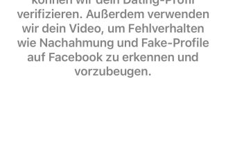 Vielen Dank für dein Video! Damit können wir dein Dating-Profil verifizieren. Außerdem verwenden wir dein Video, um Fehlverhalten wie Nachahmungen und Fake-Profile auf Facebook zu erkennen und vorzubeugen.