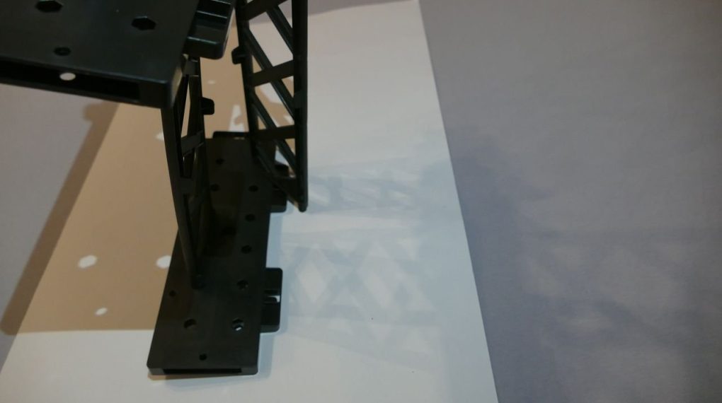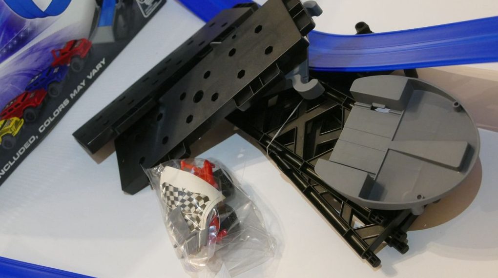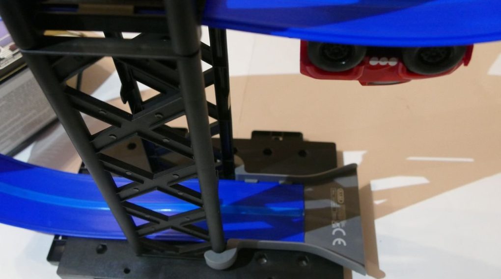 Die Aufbauanleitung ist auf der Rückseite der recht großen Verpackung (36×27,5×7,5 cm) aufgedruckt. Es müssen lediglich ein paar Teile zusammengesteckt werden, was recht schnell gelingt. Für die Zielrampe ganz oben liegen noch zwei Fahnen mit vier Aufklebern bei. Beim Auto sind die Aufkleber bereits aufgeklebt, jedoch recht schief.