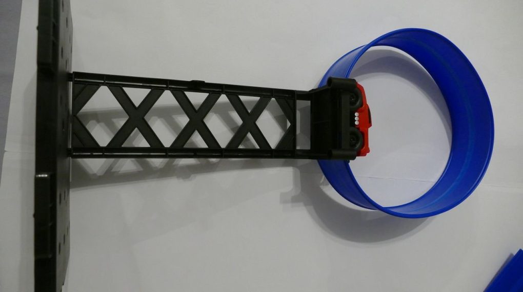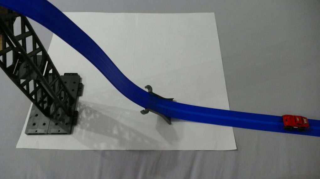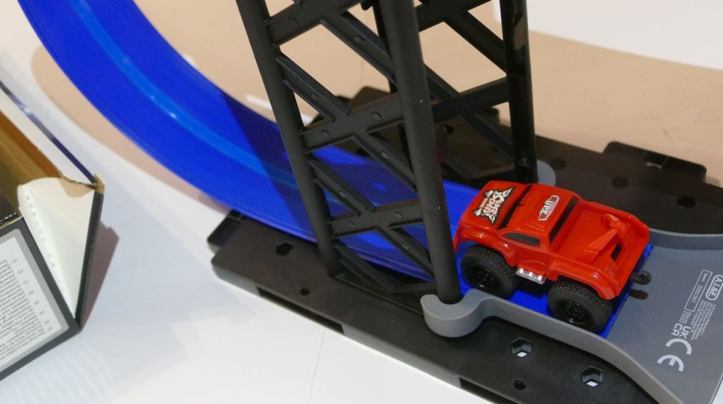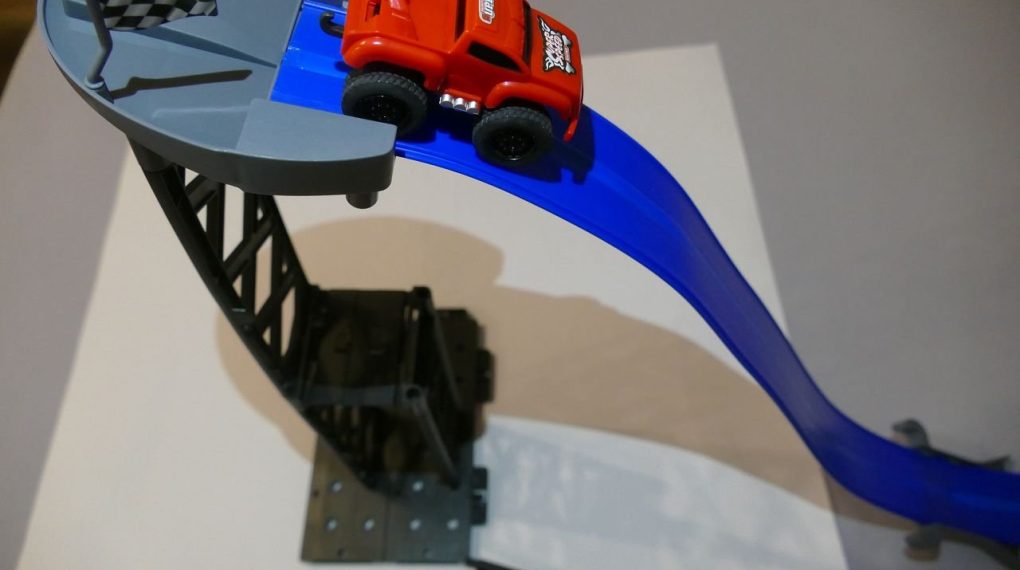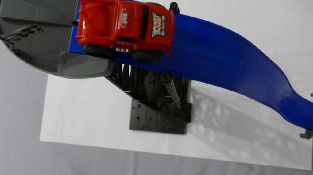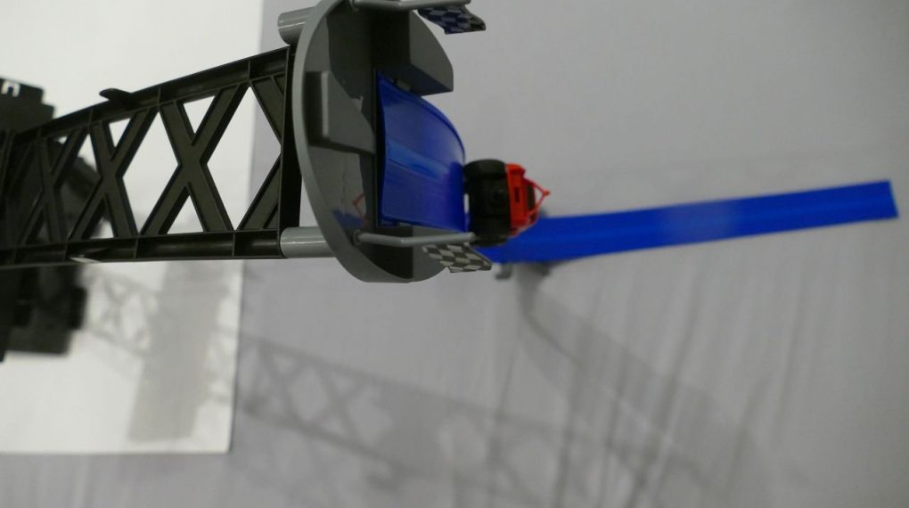 Wenn wir also dem Rennwagen mit Schwungantrieb genug Schwung mitgegeben haben, setzen wir diesen schnell unten auf die Bahn und das Auto fährt, bei genug Antrieb, bis nach oben ins Ziel und fährt sich dort fest. Hurra!