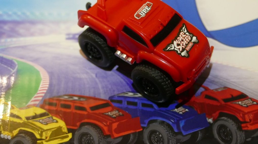 Das mitgelieferte Rennauto, bei mir ein roter Pickup, ist ein Spielzeugauto zum Anschieben. Also diese Autos, die man mehrmals auf dem Boden nach vorne bewegt und dadurch immer schneller werden. Unter dem Auto befinden sich zwei kleine Magnete unter der Plastikkarosserie. Die blaue Rennbahn ist mit einem Magnetstreifen in der Mitte beschichtet. Dabei ist es beim Aufbau übrigens egal wie herum man die Bahnteile aufbaut, beide Seiten sind gleich.