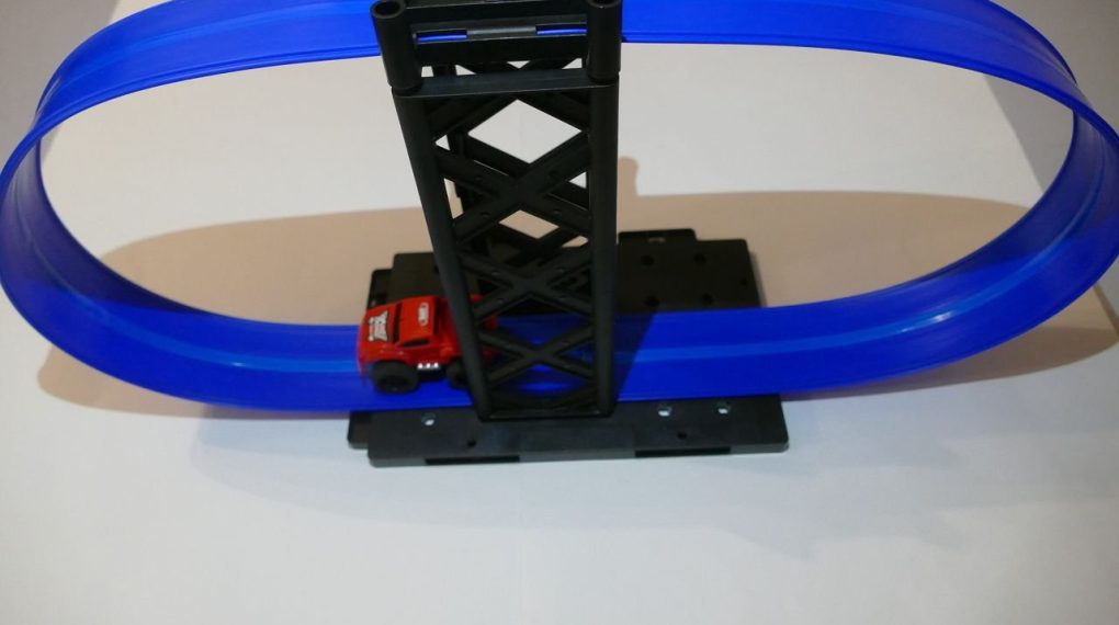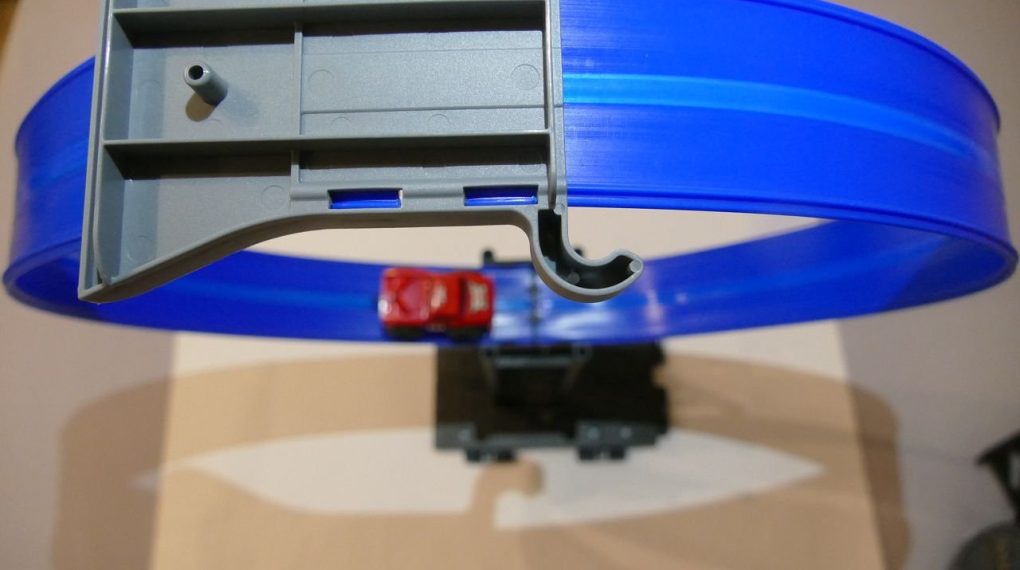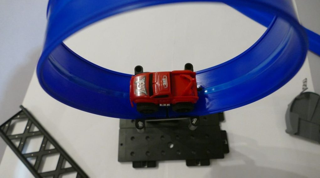 Dabei gibt es mehrere Varianten dieser Autorennbahn. Nicht im KODi, wo ich es gekauft habe, dort gab es nur diese Variante. Und nur im Laden vor Ort, nicht online. Aber auch diese vertikale Rennbahn gibt es noch in einer Nummer größer, quasi noch einmal mehr um die Kurve nach oben. Ebenso scheint es eine Variante nur mit einem in sich geschlossenen Looping zu geben. Mit dabei ist immer ein Auto, zufällig ausgewählt aus einer von vier Varianten. Dieses kann man sich also nicht aussuchen.
