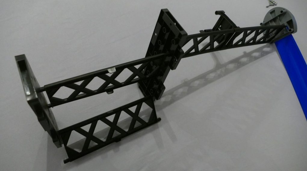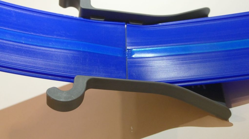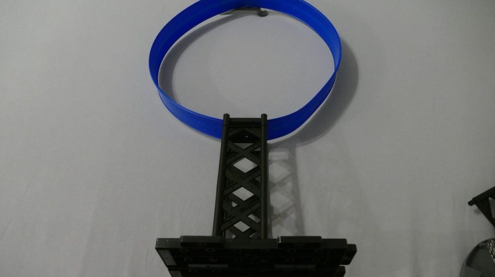 Voilà: Die Bahn ist fertig aufgebaut. Mit einer Maße von 47x16x50cm ist die Bahn eine Rennstrecke, die nach oben aufgebaut ist. Die Unterteile sind eigentlich nur 22 cm lang, doch die gebogenen Bahnen ragen seitlich heraus.