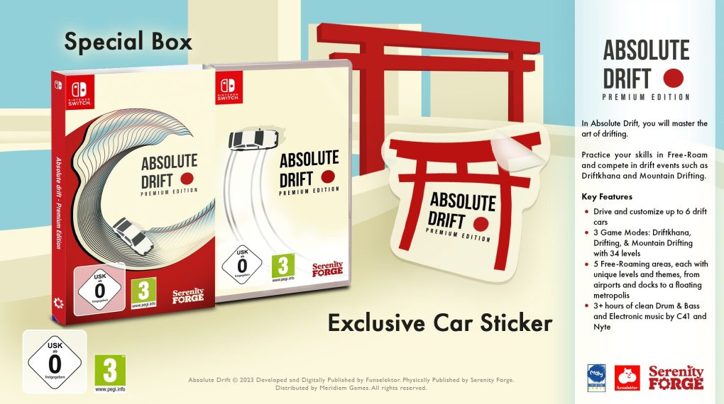 Meridiem Games wird für das Design und die Herstellung der Premium Edition von Absolute Drift in einer speziellen Box sowie für den Vertrieb im europäischen Fachhandel verantwortlich sein. Die Premium Edition wird eine spezielle Hülle mit exklusivem Artwork und einen Aufkleber für Ihr Autofenster enthalten.