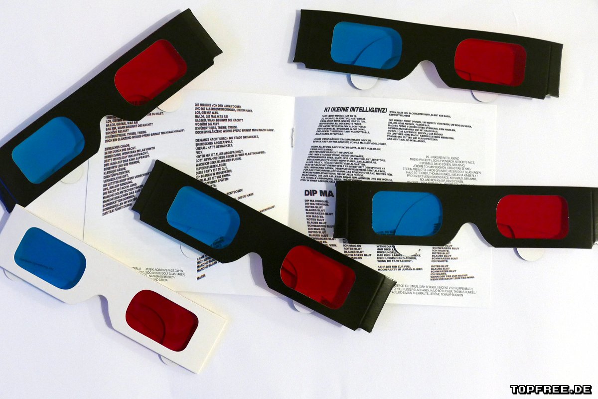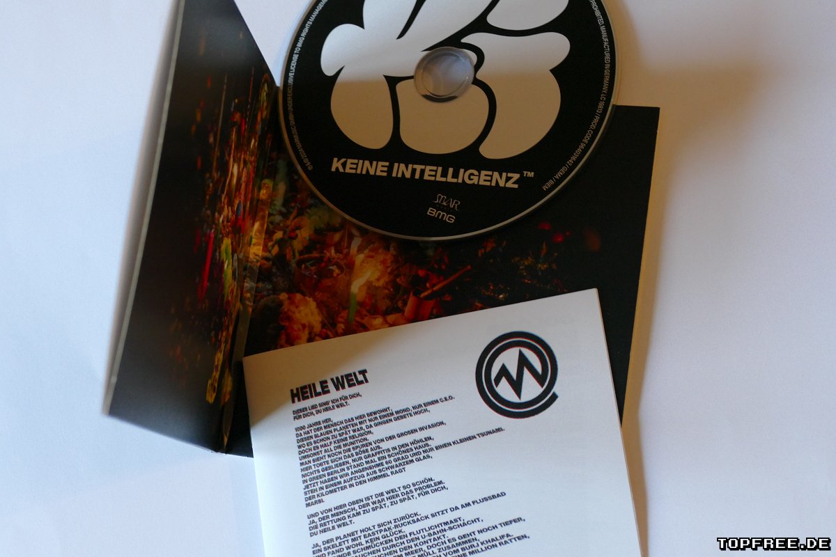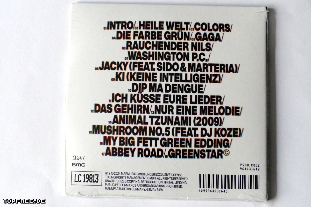 Das Album kommt in einer aufklappbaren Digisleeve-Hülle aus Pappe daher mit Schuber für die Musik-CD sowie einem 12-seitigen Booklet. Letzteres gefällt mir ebenfalls bei Alben sehr, doch leider sind diese immer weniger vorhanden oder es wird sich keine Mühe mehr gegeben. Das Booklet besteht bei Keine Intelligenz ebenfalls nur aus den Liedtexten, aber immerhin. Die Lyrics sind allerdings ein bisschen Star Wars-like mit 3D-Bild Schattierungen relativ klein durch die Schräglage in Großschrift abgedruckt. Meine 3D-Brille brachte allerdings keinen 3D-Effekt hervor. Ob in den Texten Fehler sind, oder es zwischendurch wirklich beispielsweise „Fee WLAN“ (in GAGA) heißen soll, ist die Frage. Leider gibt es keinen letzten Gruß von Marsimoto. Das hätte ich mir zumindest für die Albumkäufer im Booklet gewünscht. Immerhin gibt es eins. Gedruckt ist es eher matt und fühlt sich tatsächlich … cool an. Die Texte hat Marsimoto nicht alle selbst verfasst. Beteiligt waren an den Liedern zudem noch u.a. Yasha Conen, Nils Rudolf Glashagen (mit dem passenden Instagram-Profilbild), Hajo R. Bötticher, Thomas Runkel, Jakob Grunert, Tobi Regel, Stephen Rickert, Ben Burgwinkel, Joana Emetz, Natasha Kimberly und Sara Torchani. Einzig am letzten Lied „Greenstar©“ und dem „Animal Tzunami (2009)“ hat Marsimoto alleine getextet. Der „rauchende Nils“ ist an allen anderen Texten mit beteiligt.