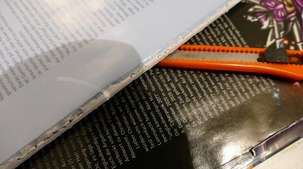 Nicht optimal gestaltet sich die Möglichkeit die Vorderseite direkt mit einem Kuttermesser auszuschneiden (Bild oben schwarz). Das Heraustrennen vorab ist aber umso einfacher (Bild oben hell).