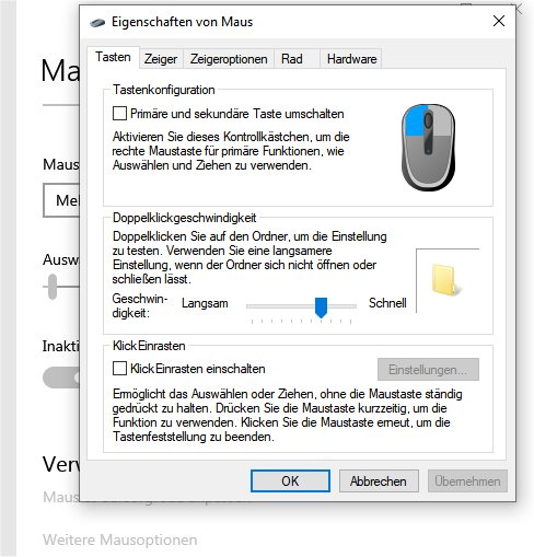 Unter Windows gibt es beispielsweise die Möglichkeit die Geschwindigkeit des Doppelklicks festzulegen. Dazu geht man über die „Systemsteuerung“ zu „Hardware und Sound“ und bei „Geräte und Drucker“ auf „Maus“. Bei „Tasten“ legt man nun die „Doppelklickgeschwindigkeit“ fest. Alternativ findet man dieses Punkt unter der Lupe und gibt „Maus“ ein und klickt die „Mauseinstellungen“ unter „Weitere Mausoptionen“ an. Über das rechte Ordnersymbol könnt ihr den Doppelklick testen. Versucht den Doppelklick etwas langsamer zu machen, da die meisten Probleme durch einen sofortigen Wiederklick ausgelöst werden.
