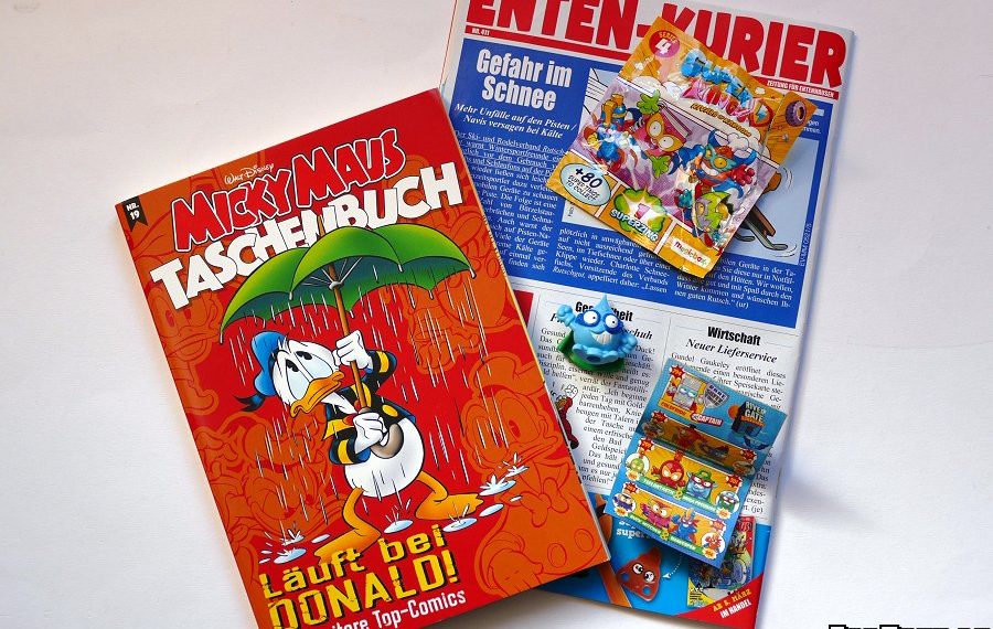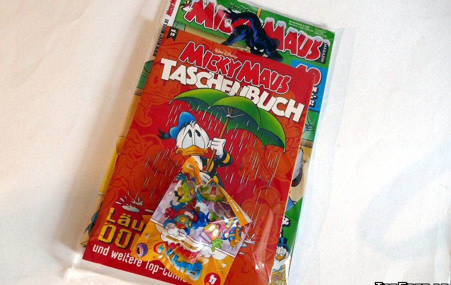 Das Micky Maus Magazin erscheint alle zwei Wochen. Die wöchentliche Erscheinungsweise ist schon lange gestrichen. Dafür beträgt der Preis mittlerweile aber auch stolze 3,99 Euro. Die Beilage, also das Gimmick, ist meist – Sorry! – Plastikmüll. Bei dieser aktuellen Ausgabe aber interessant. Denn als Beilage gibt es dieses Mal ein Micky Maus-Taschenbuch oder Comic-Buch. Bei meinem am Zeitschriftenladen letzten erhältlichen Micky Maus Magazin lag die Nummer 19 aus dem Jahre 2020 bei. Zunächst dachte ich, es wäre sogar das aktuelle, was ich mir aber nicht vorstellen konnte. Denn im Taschenbuch war dauernd Werbung für weiter Hefte. Angespriesen für den „14.02.“ oder, dass das nächste Buch am „20. März im Handel“ ist. Das passt zeitlich natürlich alles, aber ist halt vor von einem Jahr. „Läuft bei Donald“ lautet der Titel des 148-seitigen Comicbuches im Taschenformat. Das ist eine richtige gute Beilage, kostet das Taschenbuch regulär 4,99 Euro – also mehr als der Heftpreis. Klar, ist es hier eine Resteverwertung, aber wenn man es noch nicht hat, bekommt man Comic en massse. Dazu liegt noch eine eingepackte Figur aus der „SuperZings Serie 4“ dabei.