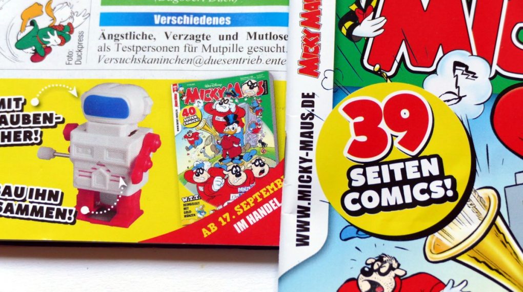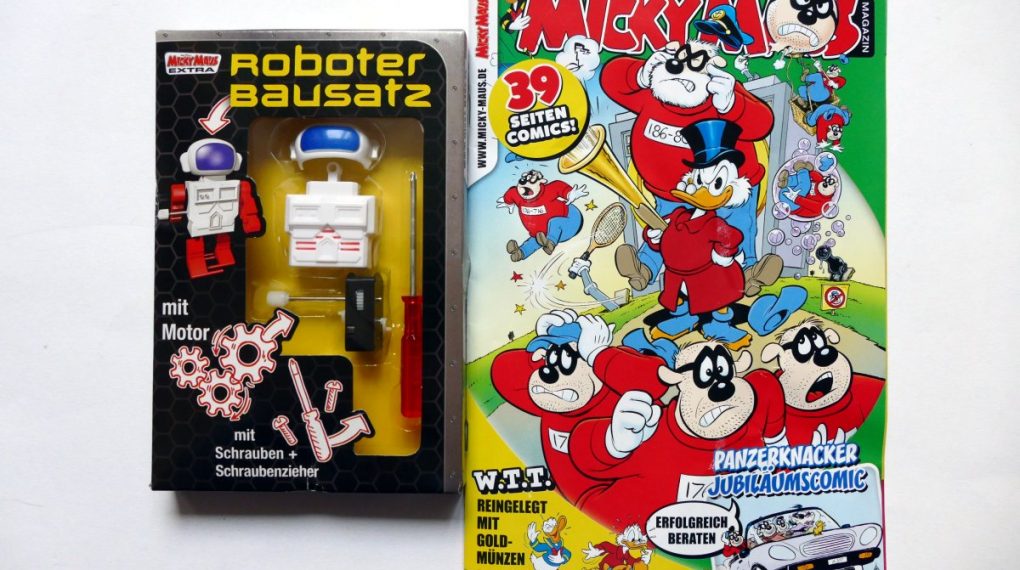 Ja, ich gebe zu: Ich bin ein Gimmick-Käufer. Ob die jüngere Generation auch noch so denkt? Ich denke schon! Denn im Zeitschriftenregal gibt es allerhand (minderwertige) Magazine mit (meist leider ebenso minderwertigen) Beilagen. Dieses Extra bietet neben Plastik aber tatsächlich mehrere Aspekte: Zusammenbauen, Schrauben und Spielen. Also gar nicht so schlecht. Zudem sieht der Roboter noch ganz süß aus, aber das ist wohl Ansichtssache. Helferlein zu basteln, wäre man etwas gewesen, doch der Roboter von Daniel Düsentrieb fährt halt nur auf einem Rad. Als Comic einfacher zu zeichnen als zu basteln und hinzustellen.