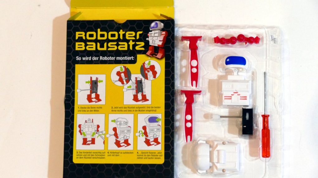 Auf der Rückseite der Verpackung des Roboters befindet sich die bebilderte Kurzanleitung. Nicht ganz klar ist, wie die Arme positioniert werden. Laut der Anleitung ist der rechte Arm vorne, der linke weiter hinten. Auf allen Bildern ist es umgekehrt. Tatsächlich spielen die Roboterarme am Ende eine Rolle. Ansonsten ist alles, teilweise etwas friemelig, zum Zusammenstecken. Ist der Motor mit den Beinen aber richtig eingelegt, wird alles nur noch aufgesteckt und der Rücken mit dem Vorderteil zusammengeschraubt. Dafür liegen zwei kleine Kreuzschrauben inklusive passendem Schraubenzieher bei. Hey, ein neuer Schraubenzieher! Praktisch. Bei meinem ersten Versuch waren die Arme nicht ganz richtig eingelegt. Sprich: Der Roboter lief nicht. denn es verhakte sich im Inneren immer wieder. Nach ein paar Versuchen wackelte der Roboter ein paar Schritte und … fiel um. Wer Spaß am Basteln hat, kann ein wenig Finetuning vornehmen. Ganz witzig ist, dass der Kopf mit wackelt. Sieht irgendwie wieder süß aus.
