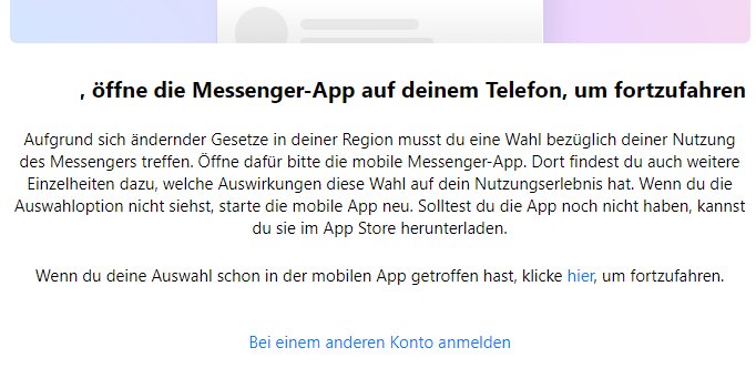 Dabei bekommt man beim öffnen des Messenger im Browser am PC, Laptop oder sonstigen Geräten, mit denen man den Messenger ohne App öffnet, den oberen Hinweis angezeigt. Nutzt man beispielsweise gar keine App, kann man den Messenger wohl gar nicht mehr verwenden.