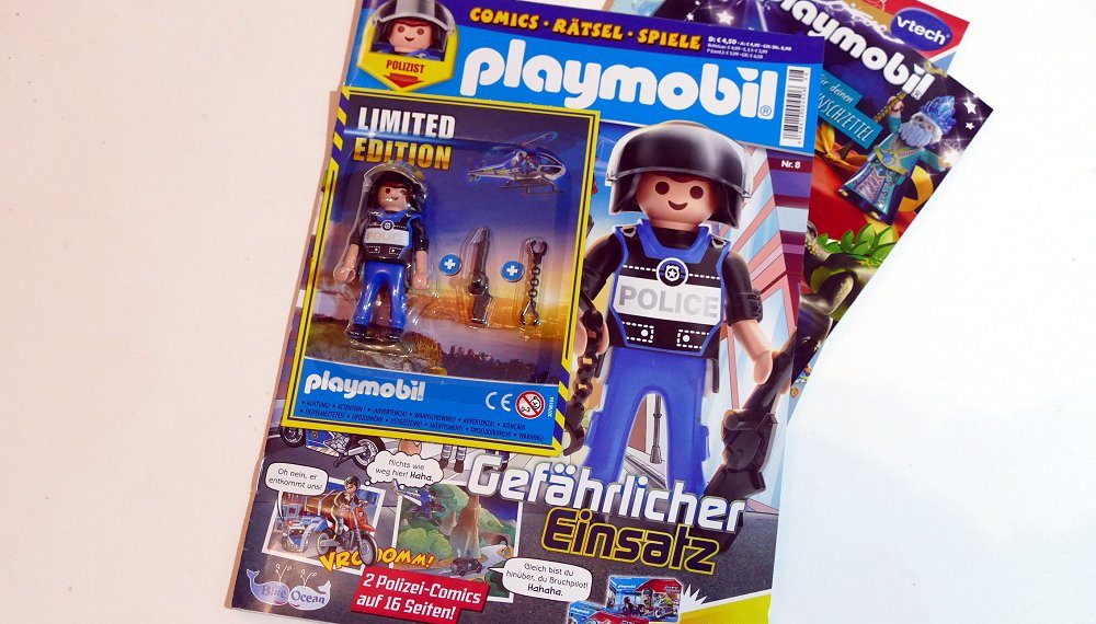 In Ausgabe 08/2021, der Nr. 8, wie auf dem Cover steht, dreht sich alles rund um die Polizei. So gibt es eine „Limited Edition“ mit einem Polizisten. Der Playmobilfigur liegt ein Gewehr und Handschellen bei. Bin ich jetzt spießig, wenn ich ein Gewehr in einem Kindermagazin komisch finde? Nun denn. Der Polizist in blauer Uniform, beziehungsweise mit blauer Weste und der Aufschrift „POLICE“ ist eine normalgroße Figur in bewährter Playmobil-Qualität. Also so gesehen ganz cool!
