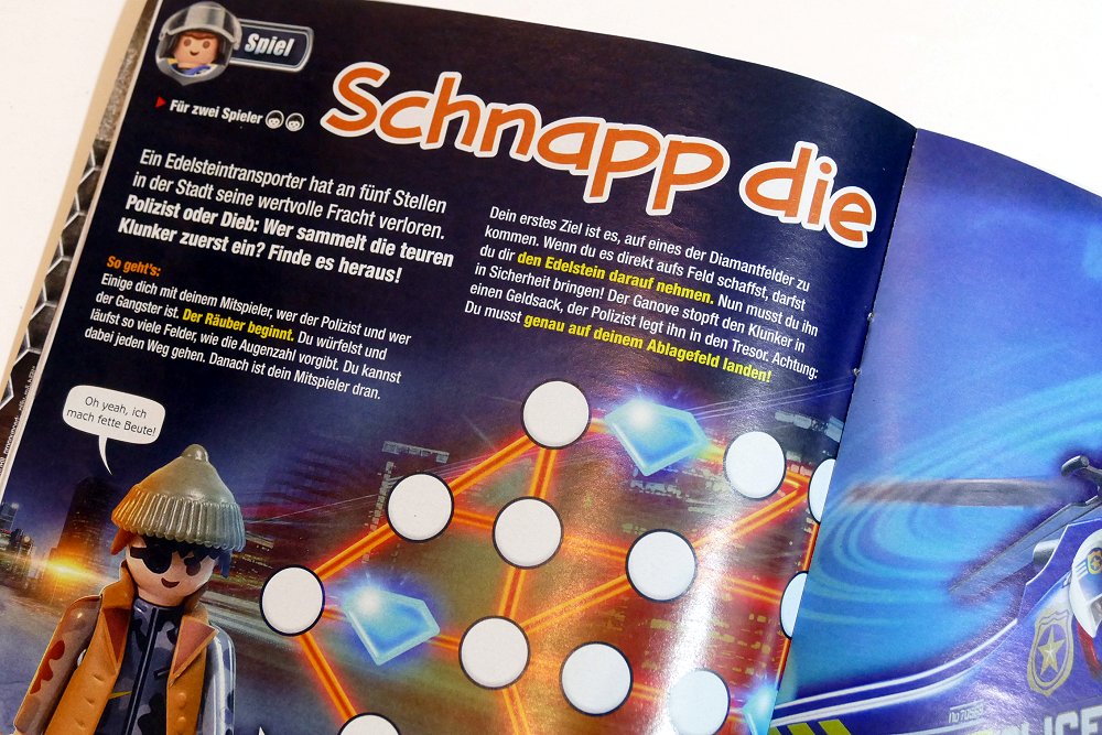 Danach folgt auf Seite 16 und 21 – in der Mitte ist ein doppelseitiges Poster eingeheftet – ein Spiel für zwei Spieler. Das ist wiederum wirklich cool! Einer spielt den Polizisten, der andere ist der Dieb. Dann wird gewürfelt und versucht die vorher ausgeschnittenen Diamanten zu ergattern. Als Polizist in den Tresor, als Dieb ins Versteck. Finde ich wirklich gut gemacht!