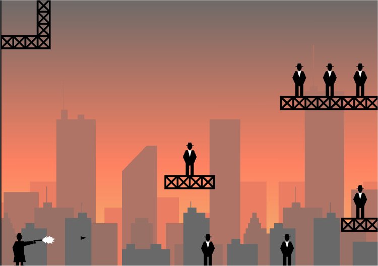 Das Gameplay bleibt bestehen. Dafür sehen die Hintergründe etwas netter aus und die schwarzen Männer tragen jetzt ein weißes Hemd unter ihrem Sakko. Ansonsten heißt es (mit der Maus) zielen, schießen (linke Maustaste) und vorher den Winkel gut berechnen. Denn so wenig Schüsse wie möglich sollten es sein, um so viele Gegner wie möglich zu treffen. Quasi ein Arkanoid-Shooter.