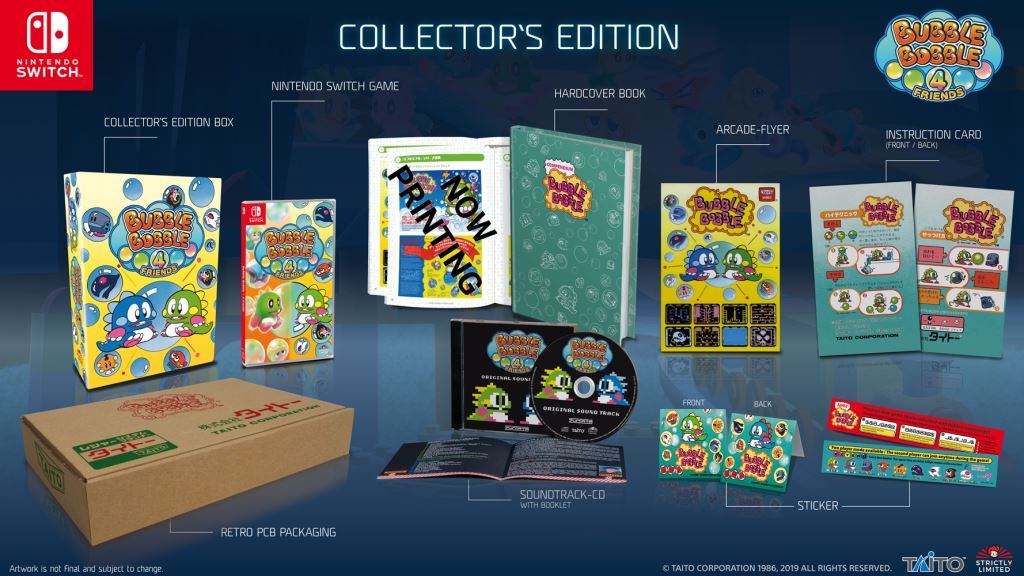 Ab Sonntag, dem 27. Oktober, können beide Editionen für Nintendo Switch exklusiv im Webshop von Strictly Limited Games vorbestellt werden. Die limitierte Standard Edition wird mit einem exklusiven Cover und individueller Nummerierung zum Preis von 39,99 Euro angeboten werden. Mit der Collector´s Edition sollen die Ursprünge dieses Meilensteins der Videospielgeschichte auf ganz besondere Weise gefeiert werden. Entsprechend enthält sie zahlreiche Items rund um Bubble Bobble und dessen Geschichte, die mit viel Liebe zum Detail aus dem Japanischen übersetzt wurde, um sie Fans und Sammlern zugänglich machen zu können. Die Collector’s Edition wird zum Preis von 89,99 Euro angeboten werden.