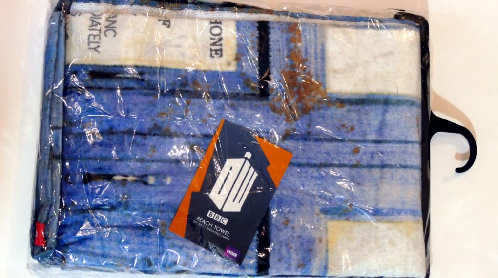 Dann kam mir wieder die Idee: Eine Tardis als Tuch. Als großes Tuch. Doch keine schlechte Idee. Was ist ein großes Tuch? Tardis Bettwäsche? Ein Handtuch? Eher nicht so groß. Ein Badetuch? Ja! Gibt es Badetüchter mit einer TARDIS? Ja! Es gibt sogar verschiedene Bade- bzw. Strandtücher mit diesem Motiv. Eins in der Größe von 140 cm x 70 cm bei und von getDigital. Weitere Motive wiederum bei Amazon.de. Allerdings sollte die TARDIS schon das ganz Badetuch bedecken und keine Ränder oder sontigen spielerischen Motive haben. Am Ende fand ich das Badetuch Tardis Distressed. Sowas wie benutzt oder eher dem Motiv nach zu urteilen beschmutzt. Dennoch sieht es irgendwie cool aus und für eine Tür vielleicht gar nicht so unpassend. Dazu kommt die Größe von 150 cm hoch und 75 cm breit. Also größer als die anderen Badetücher und genau passend, um bis zur Türklinke zu reichen. Klingt schon einmal gut. Dieses Tuch soll zudem recht dünn sein, was als Handtuch zum Abtrocken eher subtopimal wäre, aber für meine Zwecke genau richtig. Ein flauschiges Handtuch wollte ich mir jetzt nicht an die Tür hängen. Gekauft habe ich es mir letztendlich im Onlineshop von Elbenwald, die zudem zahlreiche Filialen in Deutschland haben – und ich mir aufgrund von ab 20 Euro versandkostenfrei, das „Doctor Who – Distressed Tardis Badetuch“ kostet 19,95 Euro, … den Marvel Avengers Powerfruit Punch (Geschmackstest bei TopFree.de) für 2,99 Euro mitbestellt habe … der Versand hätte sonst 3,99 Euro zusätzlich gekostet. Lange Rede kurzer Sinn: Kommen wir zum ausgewählten Badetuch.