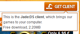 Nachdem ein Spiel dann nach erfolgreicher Bezahlung freigeschaltet wurde, erscheint es im Jade:DS Clienten. Dieser kann über die Schaltfläche „GET CLIENT“ rechts oben auf der Website heruntergeladen werden.