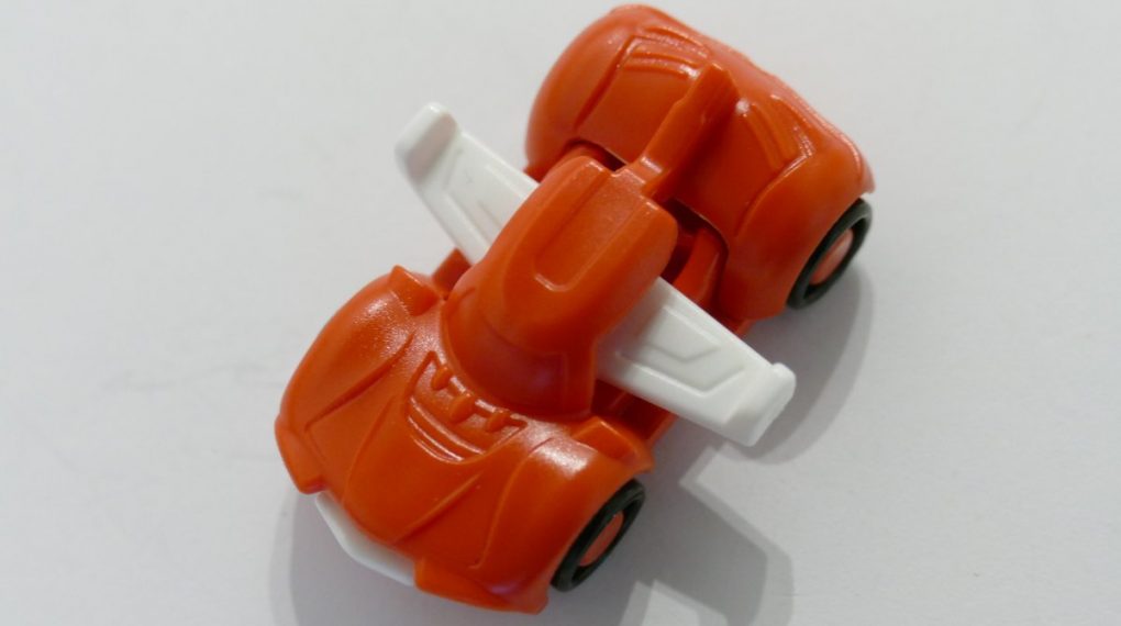 Naja, es ist halt ein … Plastikspielzeugauto. Immerhin mit einem beweglichen Teil. Zum Spielen allemal geeignet. Zur Ansicht eher nicht so schön. Dennoch steht die Karre erst einmal im Egal äh Regal.
