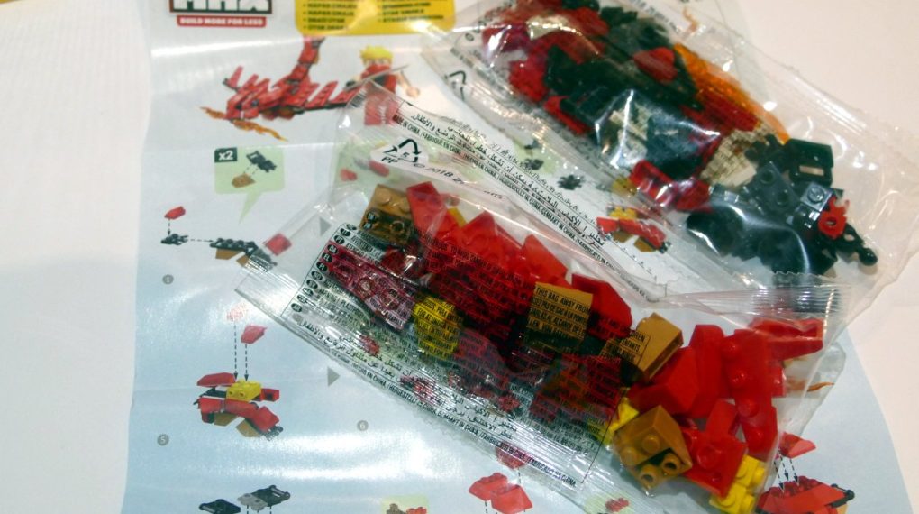 Geöffnet kommen zwei Plastiktüten (jeweils mit dem Jahresaufdruck 2018) mit den Steinchen zum Vorschein sowie eine Anleitung. Die Figur ist im Inneren des Kartons festgeklebt und muss separat entfernt werden.