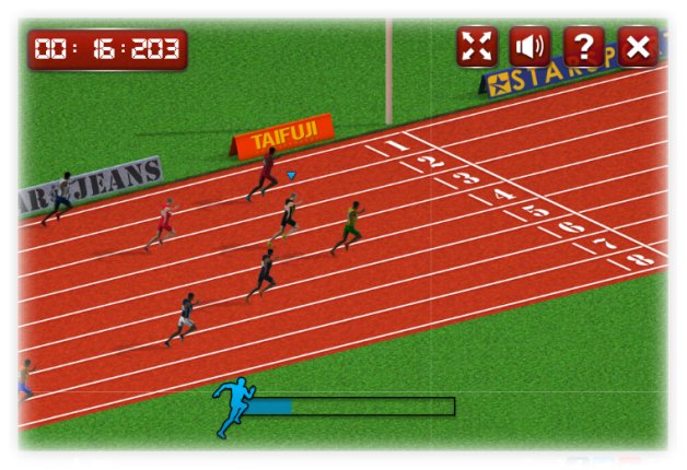 In feinster Decathlon-Technik geht es die 100 Meter entlang. Aber pass auf: Denn die Energieleiste ist nicht unendlich. Wenn du einfach drauf losrennst, bist du zwar bis kurz vor der Zielgeraden Erster, wirst aber am Ende Letzter. Ohne Energie geht halt nix bis zum Schluss, das ist überall so!