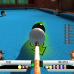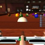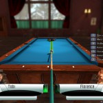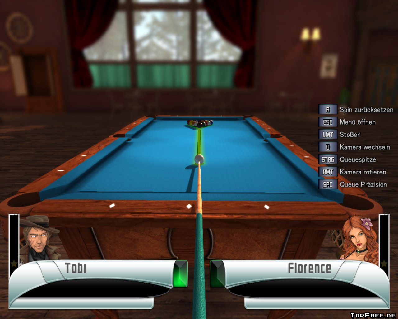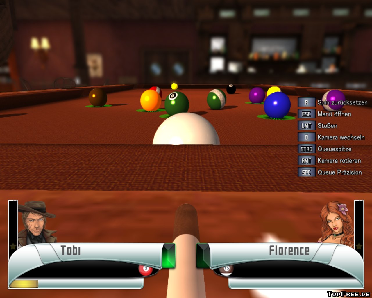 Nach dem Laden erscheint der ausgewählte Spieltisch samt Kugeln. Rechts sind die Hotkeys aufgelistet und unten die Profile der Spieler. Was leider direkt auffällt ist, dass die Kugel für den ersten Stoß im normalen Kameramodus leider immer nach dem Bewegen der Maustaste weiter über den Tisch „schwebt“. Ruhig stehen bleibt diese nur in der zweiten Kameransicht, aus der Vogelperspektive und lässt sich damit verünftig hinlegen. Dennoch merkt man auch der von-oben-Sicht, dass die Kugel dem Mauspfeil immer etwas hinterherhinkt. Statt nach oben und unten, muss man die Maus zudem nach links und rechts bewegen. Für die Draufsicht wäre zur einfachen Gewöhnung dieselbe Steuerrichtung besser gewesen. Oft muss ich die Maus neu ansetzen, weil ich mit einem Schwenker nicht ganz herum komme. In der normalen 3D-Ansicht hat man die Möglichkeit mit der rechten Maustaste für eine Rundumsicht – allerdings etwas eingeschränkt, ein reines Umschauen ist, wenn man an der Reihe ist, nicht möglich. Mit dem Mausrad kann noch geszoomt werden. Die normale 3D-Ansicht finde ich recht unübersichtlich, von oben hingegen ist die Steuerung gerade beim ständigen Wechsel gewöhnungsbedürftig. Manchmal kan man leider, je nach Raum und gewählten Kugeln sowie Grafikeinstellungen, die Farben nicht gut unterschieden. Schwarz? Blau? Oder doch eine blaue?