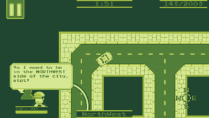 Das Ziel ist es Taxikunden von A nach B zu bringen. Die Schwierigkeit besteht darin, dass der Wagen immer den Vorwärtsgang eingelegt hat. Sprich, das Taxi bewegt sich ständig fort, Rückwärtsfahren ist nicht. Die Taxikunden können durch einen kleinen Richtungspfeil gefunden werden, am Standort angekommen, hält das Auto kurz an und fährt dann automatisch sofort wieder weiter. Jetzt heisst es: Finde den Zielort! Durch einen kurzen Text wird vermittelt, wo sich dieser ungefähr befindet. Im Westen der Stadt oder im Nordosten, als Beispiel. Gesteuert wird dabei mit links und rechts. Kommt man von der Straße ab, ist dies gar nicht gut für euren Taxiwagen. Denn dieser nimmt dadurch erheblichen Schaden auf. Stößt man zu viel gegen den Rand der Straße, qualmt der Wagen und bleibt im schlimmsten Fall stehen. Zum Glück gibt es noch die Möglichkeit der Reperatur, allerdings nur gegen Geld und dafür muss man schon ein paar Kunden erfolgreich zum ihrem Zielort gebracht haben.
