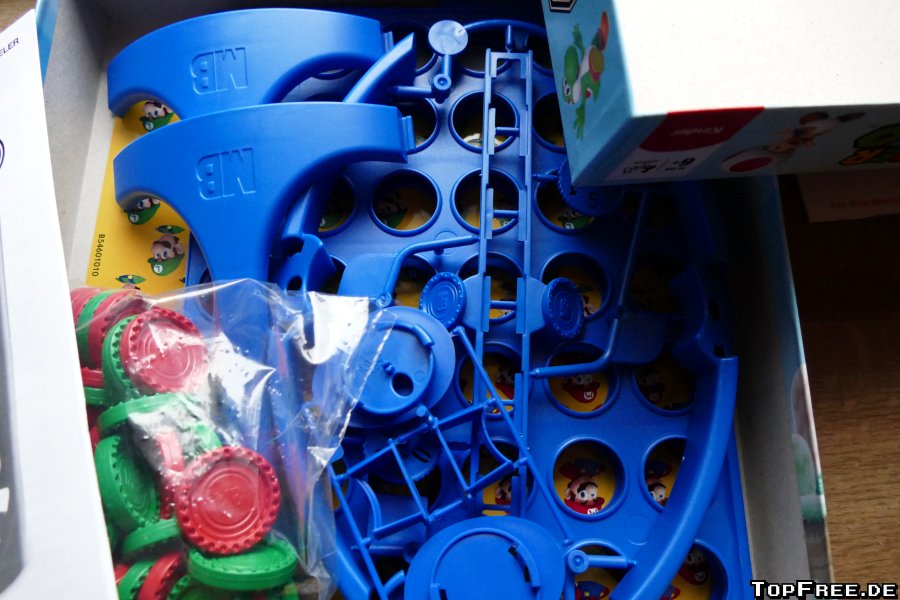 Das Spielprinzip sollte klar sein: Vier Chips seiner eigenen Farbe in einer Reihe (horizontal, vertikal oder diagonal) bedeuten den Sieg. Denn Vier gewinnt ist ein Spiel für zwei Spieler. Bei einem Unentschieden wird einfach nochmal gespielt. Bei der Variante mit Blocker, hat jeder Spieler einen Yoshi-Spielchip-Blocker. Dieser wird einfach in irgendein Loch gesteckt und alle darunterliegenden Steine sind nicht mehr erreichbar. Weitere Chips fallen einfach auf den Blocker drauf. Dabei kann ein solcher Blocker nur einmal platziert und nicht mehr verschoben werden. Dennoch kann der Blocker wieder entfernt werden, wenn man seinen Spielchip irgendwo in die oberste Reihe der Rasterwand legen kann. Danach kann man den gegnerischen Blocker entfernen, muss man aber nicht. Nochmal benutzt werden darf der Spielchip-Blocker nach dem Entfernen nicht mehr. Eine nette Variante, die das altbekannte Spielprinzip etwas auffrischt und für Abwechslung sorgt.