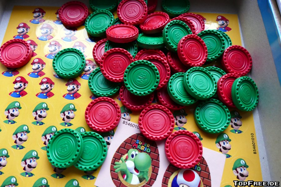 Tatsächlich ist das mein bisher größtes 4-Gewinnt-Spiel, das ich in meinem Leben gespielt habe. Zusammengebaut hat es eine nachgemessene Höhe von 25 und Breite von 26 Zentimetern. Dementsprechend groß sind auch die Spielchips, die zunächst einmal beklebt werden wollen. Natürlich kann auch so gespielt werden, ohne Motive auf den Chips. Dann hat man eben zahlreiche Super Mario- und Luigi-Aufkleber zum Verschönern von … anderen Dingen.