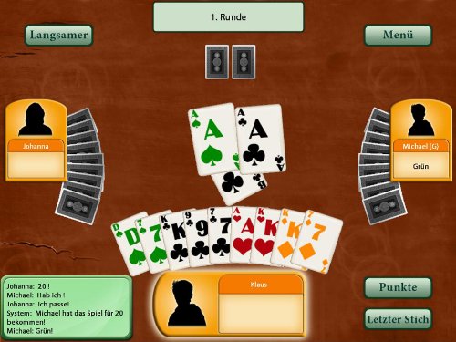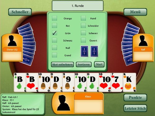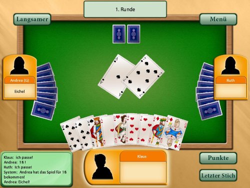 Ramschen, Kontra und Re ansagen, Bockrunden und andere frei einstellbare Varianten, verschiedene Schwierigkeitsstufen, intelligente Gegner uvm. machen Lust auf einen gemütlichen Skatabend. Wählen Sie zwischen verschiedenen Kartendecks und Spielfeldern, Deutschem oder Französischem Blatt und erstellen Sie Ihr ganz persönliches Skat-Profil.