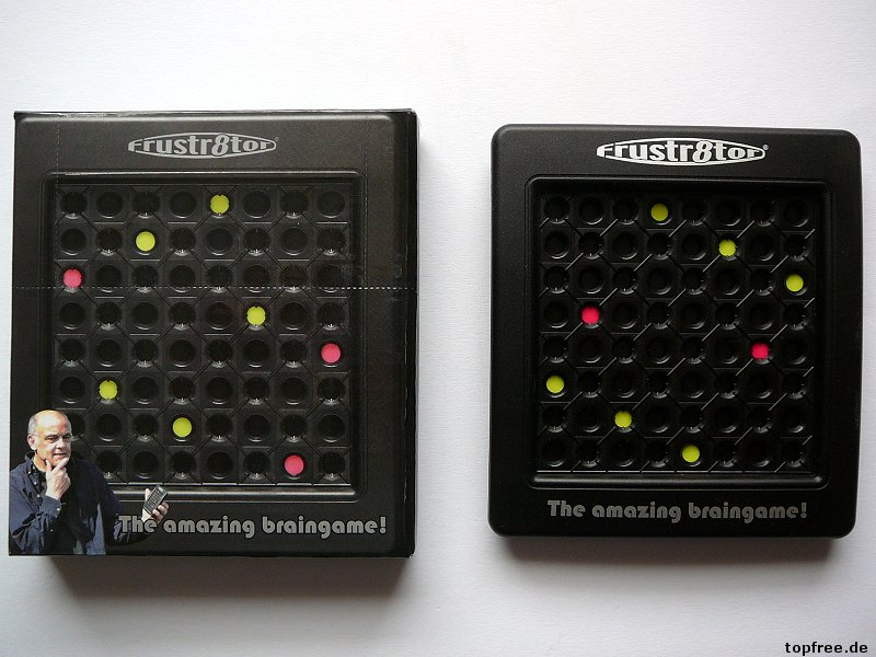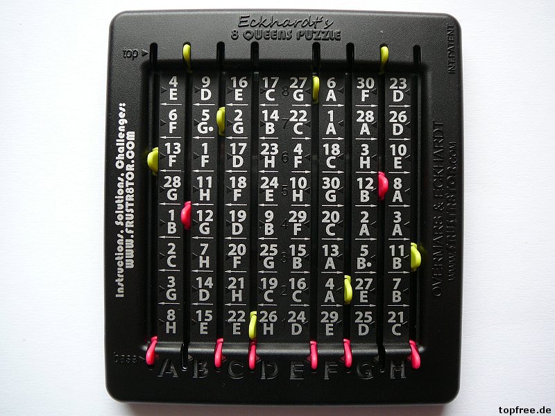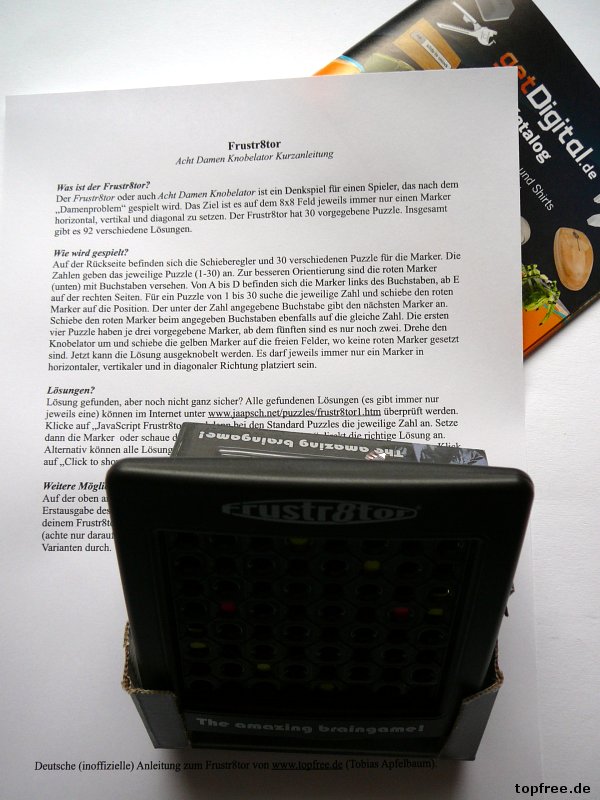 Das Acht-Damen-Problem kennen bestimmt schon ein paar. Auf einem 8×8 Feld sollen Marker so angeordnet werden, dass es weder in horizontaler und vertikaler, noch in diagonaler Richtung Überschneidungen gibt. Genau diese Anordungen können beim Acht Damen Knobelator bzw. Frustr8tor ausgeknobelt werden. Das kleine Ding aus Kunststoff in der Größe von 12 x 11 x 1,5cm liegt gut in der Hand. Da keine deutsche Anleitung mitgeliefert ist, gibt es hier auf topfree.de exklusiv eine zum Ausdrucken. Lässt sich denn mit Knobelator auch wirklich gut Knobeln?
