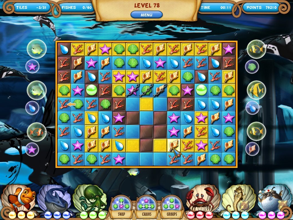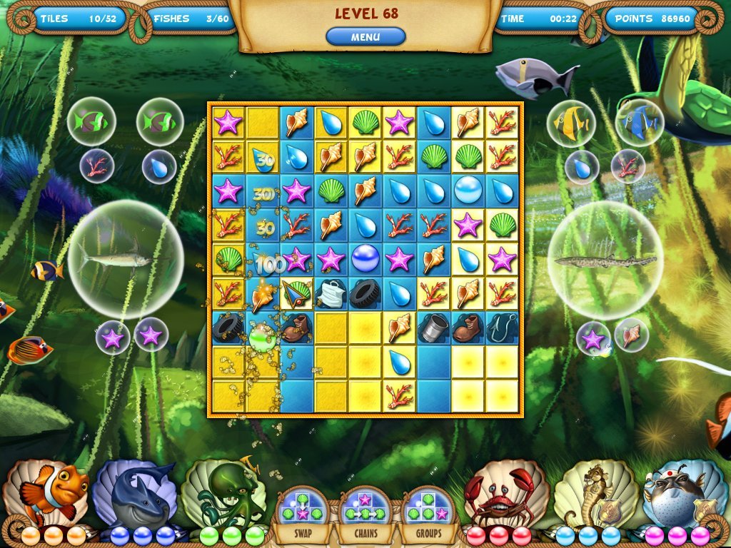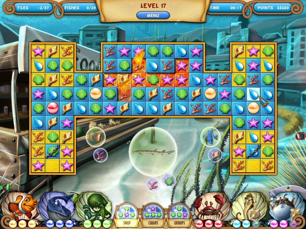 Im beliebten und bekannten Match-3-Gameplay gilt es Spielsteine durch geschickte 3er-Kombinationen abzuräumen. Dabei kann der Spieler zwischen den drei Spielarten „Tauschen“, „Ketten bilden“ und „Gruppen finden“ wechseln. Auf alle Unterwasserfreunde warten insgesamt sechs spannende Missionen mit anspruchsvollen und temporeichen Levels. Mit zahlreichen Power-ups und packenden Minigames wie „Suchbild“ und „Adventure“ kann sich der Spieler den Titel „Retter des Ozeans“ verdienen.
