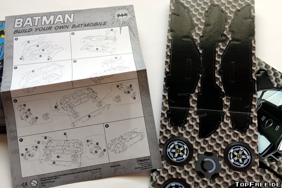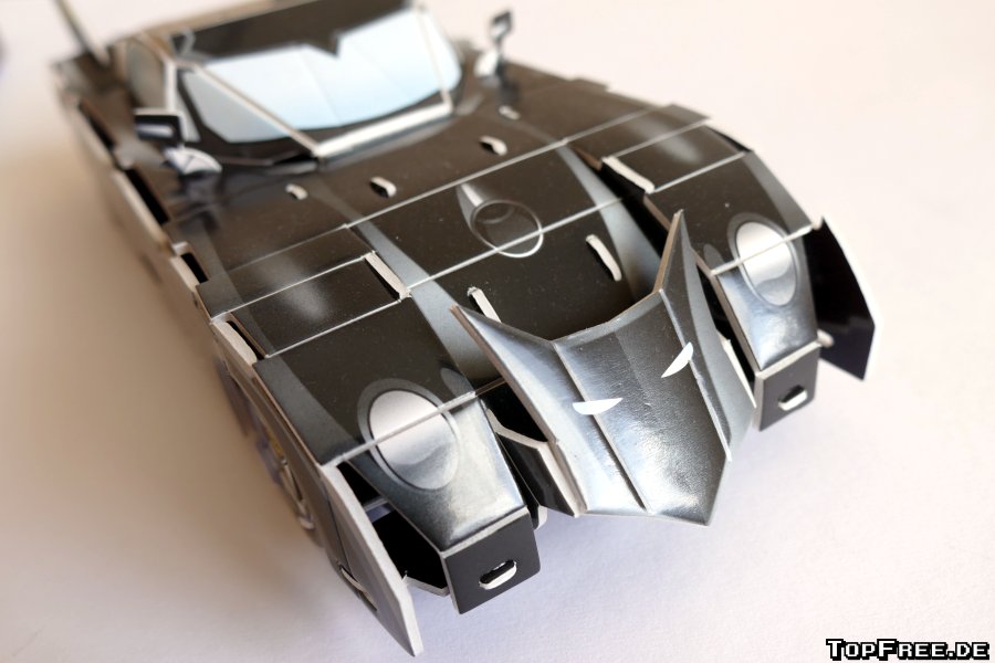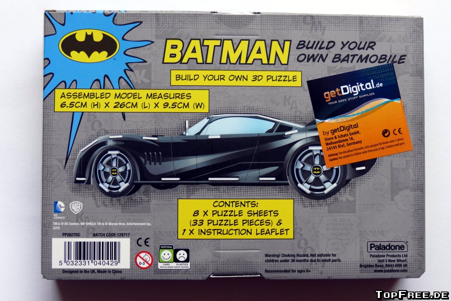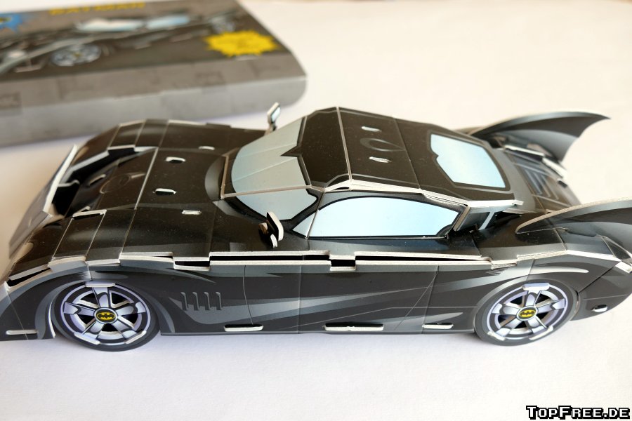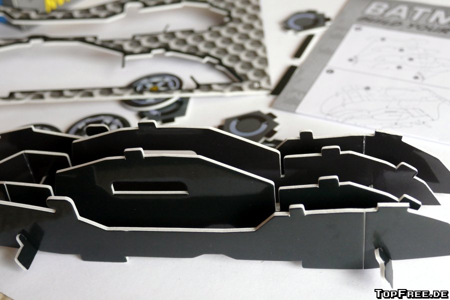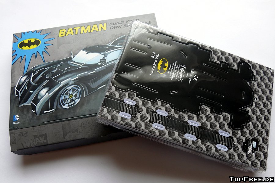 Fazit: Der Batmobil Bausatz von getDigital kostet knapp 10 Euro und bietet mal einen etwas anderen Puzzlespaß als man es sonst gewohnt ist. Die Pappe ist sehr stabil und die Puzzleteile lassen sich mühelos aus den Bögen heraustrennen. Für große und kleine Batman-Fans ein schöner Hingucker, auch wenn man natürlich auf den ersten Blick erkennt, dass dieses Batmobil aus Pappe besteht.