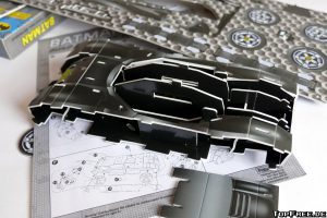 Das Zusammensetzen bereitet mit der Anleitung keine Probleme. Selbst die jüngere Generation der Batman-Fans kann problemlos das Batmobil zusammensetzen. Allerdings merkt man, dass alles aus Pappe besteht. Teilweise muss man dann noch mal mehr Druck ausüben oder Teile zurechtschieben, damit alles ineinander passt. Am Ende merkt man dann auch schon, dass es teilweise ein paar Lücken gibt, wenn man nicht hunderprozentig vorher alles richtig zusammengeschoben hat. So ist bei meinem Modell unten ein Stück rausgerutscht und die Seitenteile stehen ein klein wenig ab. Dennoch sieht es am Ende ziemlich cool aus, auch wenn man auf jeden Fall erkennen kann, dass dieses Batmobil aus Pappe besteht.