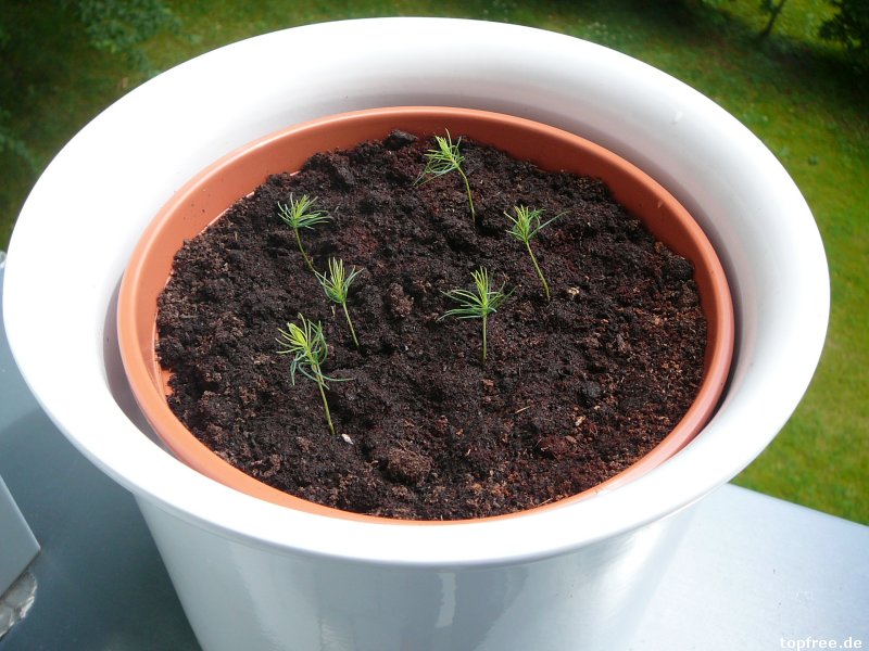Mittlerweile umgepflanzt, in einen größeren Topf, mit besserer Erde, steht die Botanicula-Pflanze auf dem Balkon. Mittlerweile ist der Tag 46 angebrochen, vor genau sieben Wochen wurde die Fichte aus dem Presskit von Daedalic zum Spiel Botanicula angepflanzt.