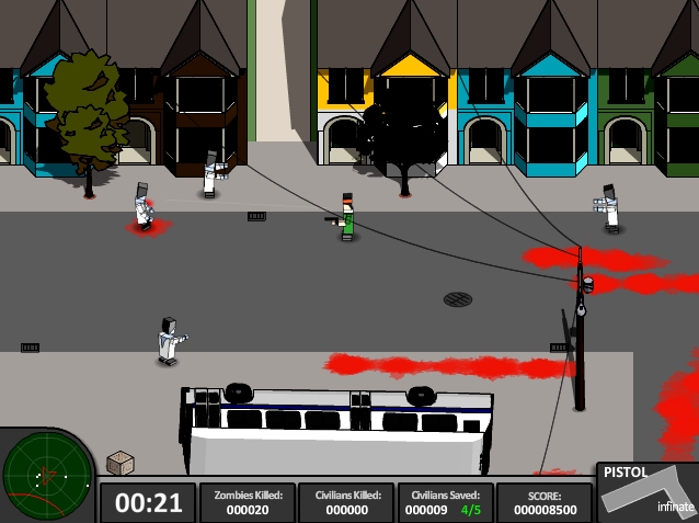In einfacher 2D-Iso-Grafik aus der Vogelperspektive tippeln wir mit Waffe via Tastatur durch die Stadt und erledigen mit der Leertaste Zombies. Falls vorhanden kann mit den Ziffern 1 bis 4 die Waffe gewechselt werden. Ist die Zeit abgelaufen oder haben die Zombies gewonnen, bleibt noch ein Eintrag die die Highscore-Liste.