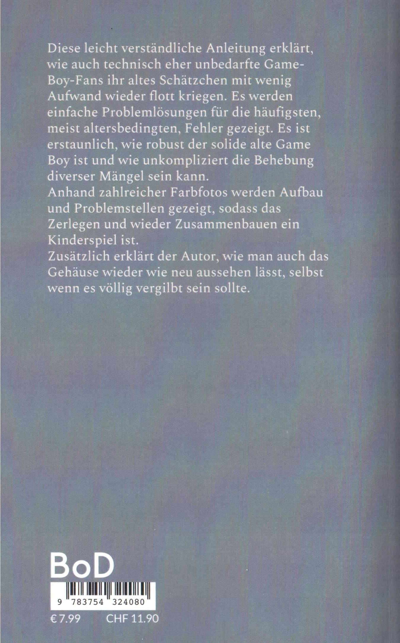 Diese leicht verständliche Anleitung erklärt, wie auch technisch eher unbedarfte Game- Boy-Fans ihr altes Schätzchen mit wenig Aufwand wieder flott kriegen. Es werden einfache Problemlösungen für die häufigsten, meist altersbedingten, Fehler gezeigt. Es ist erstaunlich, wie robust der solide alte Game Boy ist und wie unkompliziert die Behebung diverser Mängel sein kann. Anhand zahlreicher Farbfotos werden Aufbau und Problemstellen gezeigt, sodass das Zerlegen und wieder Zusammenbauen ein Kinderspiel ist. Zusätzlich erklärt der Autor, wie man auch das Gehäuse wieder wie neu aussehen lässt, selbst wenn es völlig vergilbt sein sollte.