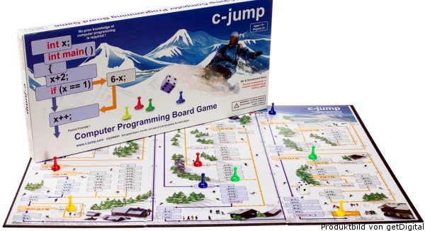 Was macht mehr Spaß als … gemeinsam Programmieren zu lernen? Gerade für Anfänger und die, die die Programmiersprache „C“ noch lernen wollen (oder müssen) eignet sich dieses englischsprachige Brettspiel besonders. Passend zur Winterzeit fährt man bei „C-Jump“ als Ski- oder Snowboardfahrer durch die C-Befehle. If? Switch? Sogar das relativ unbeliebte goto ist dabei.