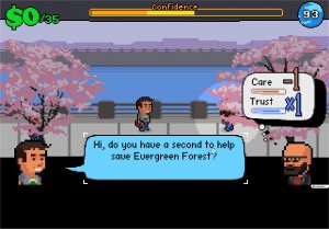 Fazit: Ein niedliches Spielchen mit knuddeliger Pixelgrafik, über das Eintreiben von Geld für eine Naturschutzorganisation. Als kostenloses Flashspiel gut gemacht. Leider fehlt etwas die Abwechslung. Zwar gibt es immer mal unterschiedliche Dialoge, doch die Antwortmöglichkeiten für dich bleiben gleich. Nach einiger Zeit wird man als Straßen-Geldeintreiber etwas mürbe. Aber die Spielidee ist interessant und eine zeitlang macht es Spaß. Dann merkt man allerdings: Das ist nix für mich!