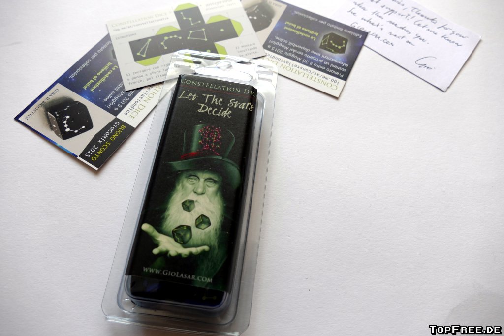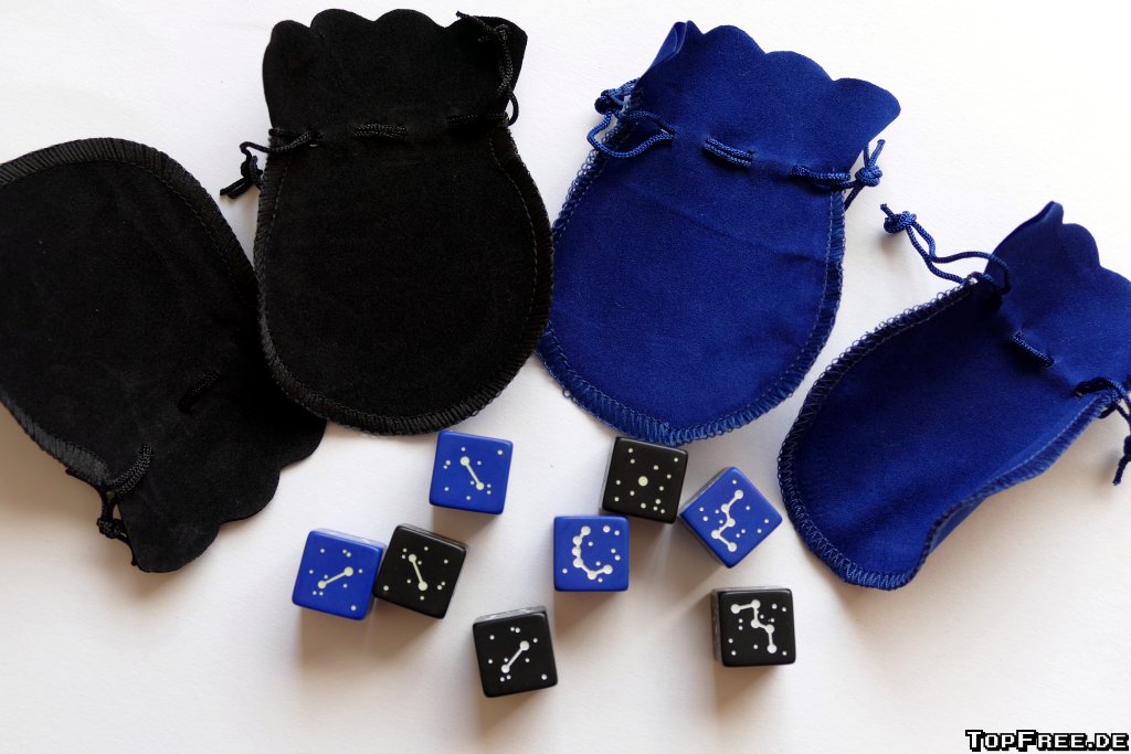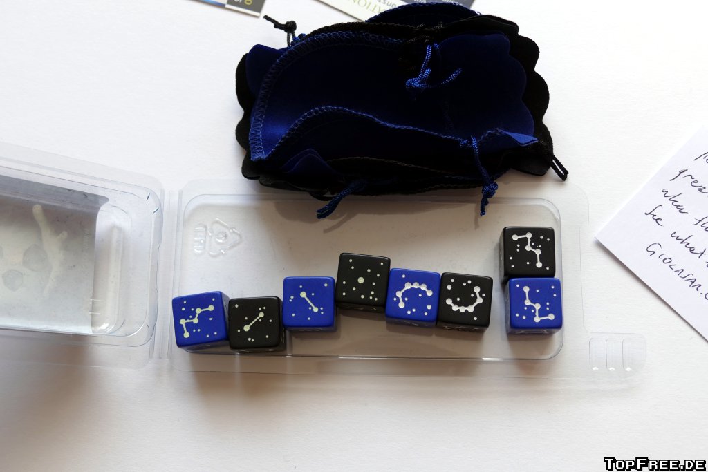Heute erreichte mich ein kleines Päckchen aus Italien. Die Sternen-Würfel von Gio Lasar sind eingetroffen! Via Indiegogo finanzierte der Designer die kleinen Würfelchen mit Sternenbildern. Constellation Dice gab es dabei in insgesamt vier verschiedenen Varationen: Schwarz oder Himmelblau sowie Leuchtend oder Normal. Ich hatte mir mal alle gegönnt.