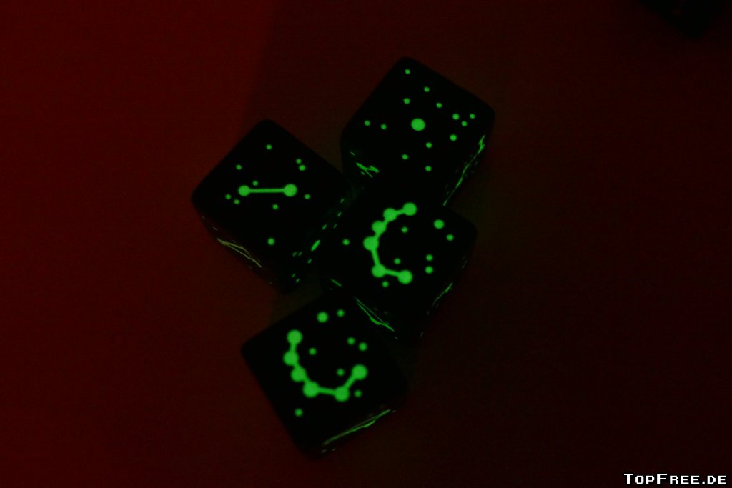 Auch wenn es natürlich nur eine Spielerei ist – oder das passende Geschenk für Astronomie-Fans – sind die Würfel sehr hübsch anzusehen. Zudem wirken die Plastikwürfel gut verarbeitet und leuchten im Dunkeln recht hell. Mit den Würfeln beim nächsten Spieleabend aufzukreuzen macht bestimmt was her. Wenn dieser dann noch abends stattfindet …