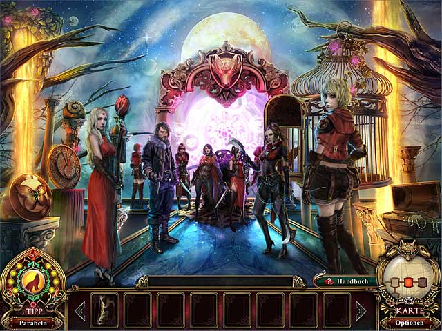 Zu Anfang gibt es 3 wählbare Schwierigkeitsmodi, 6 zu erstellende Profile und die Sammleredition geht natürlich mit Bonusmaterial und Handbuch daher, aber im Netz finden sich auch schon Komplettlösungen. Wieder hat man es hier mit Inventarbasierten Wimmelbildsuchspielen zutun, diesmal, also anders wie z.B. beim Froschkönig ist die Grafik der zu suchenden Gegenstände sehr viel besser, wobei man sich oft mit der Größe verschätzen kann. Der Tipp-Button lädt sich schnell auf – hier finden wir auch die „Chamäleonobjekte “ wieder. Der Tippbutton lässt sich im Wimmelbild, sowie auch in den Szenen verwenden, dass finde ich ganz gut, denn die integrierte Karte zeigt nicht immer an, wo ein Rätsel zu lösen ist. Dieses passiert nämlich oft auch einfach mal spontan, wenn man z.B. ein Gegenstand findet, oder sein Inventar anzuwenden weiss. So leitet einem der Tippbutton schonmal in die richtige Richtung wo etwas zutun ist. Man läuft also mehrmals in den Szenen hin und her. Es gibt auch Parabeln; hat man gewisse Gegenstände gefunden die ein Bild ergeben, werden sogenannten Parabeln freigeschaltet, diese erzählen die Geschichte des Rotkäppchens. Die Minigames sind kreativ gemacht und manchmal anspruchsvoll.