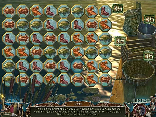 Außer zwei, drei Mal muss man in den Szenen nicht weite Strecken zurücklegen, obwohl man doch schon öfters mal kurz hin- und herswitchen muss. Das ist bekanntlich nervig. Es schaltet sich zudem schnell mal eine der sehr wenigen Wimmelbildszenen frei – ehe man es sich versieht und schwupps landen nützliche Gegenstände, die man doch recht zügig verbraucht, im Inventar. Es gibt allerdings ein, zwei Sachen, die man lange mit sich herumschleppt. Bei den Insektenkarten ging es mir so. Ich wollte sie irgendwie oftmals der Schlange anbieten, aber nee… Da es wie schon erwähnt nur wenige Wimmelbildszenen gibt, gibt es eine Vielzahl an Minigames à la Mahjongg, Match3 oder weniger knifflige Rätsel. Die Mischung ist ganz abwechslungsreich, wobei ich zuletzt dann doch diese Schatten- Spielchen nervig fand. Man sucht einen Gegenstand anhand eines Schattens, mit dem man eine Aktion ausführen muss, um den nächsten Schattengegenstand zu erhalten. Dies kam relativ häufig vor.